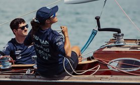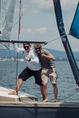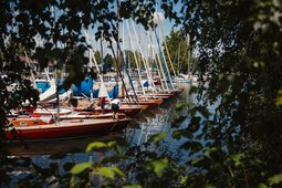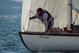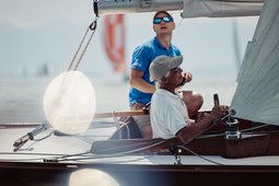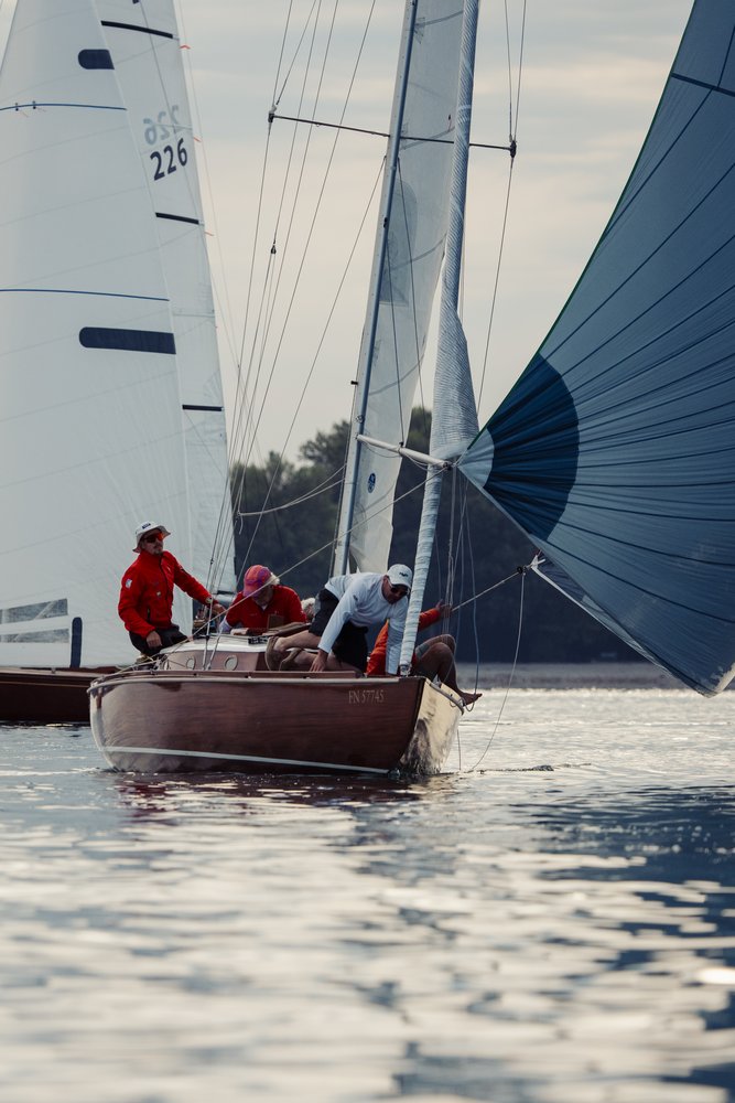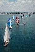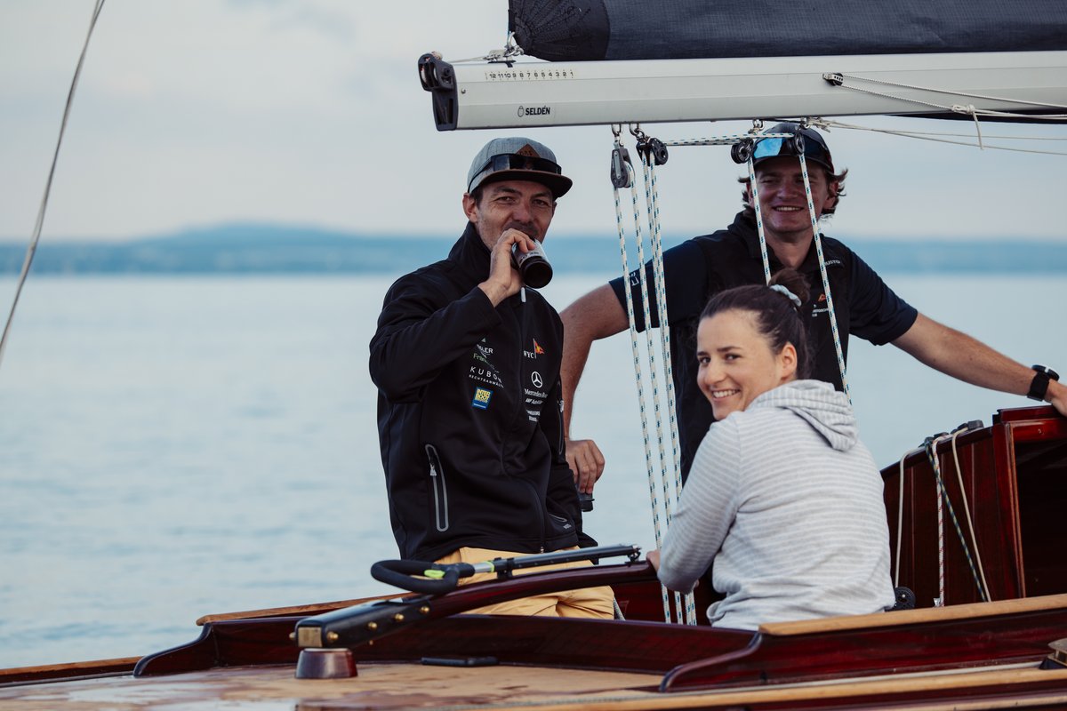 Der Freitag drohte allerdings schon sehr windarm zu werden. Trotzdem wurden wir direkt nach der Steuermannsbesprechung auf die Bahn geschickt, um jede sich bietende Chance auf segelbaren Wind zu nutzen. Der See war fast spiegelglatt, aber mit etwas Geduld stellte sich tatsächlich eine leichte Brise ein. Drei Wettfahrten konnten am Ende des Tages gesegelt werden – bei schwierigen Bedingungen und sehr leichten Winden, die volle Konzentration erforderten, taktisch anspruchsvoll, aber fair waren.