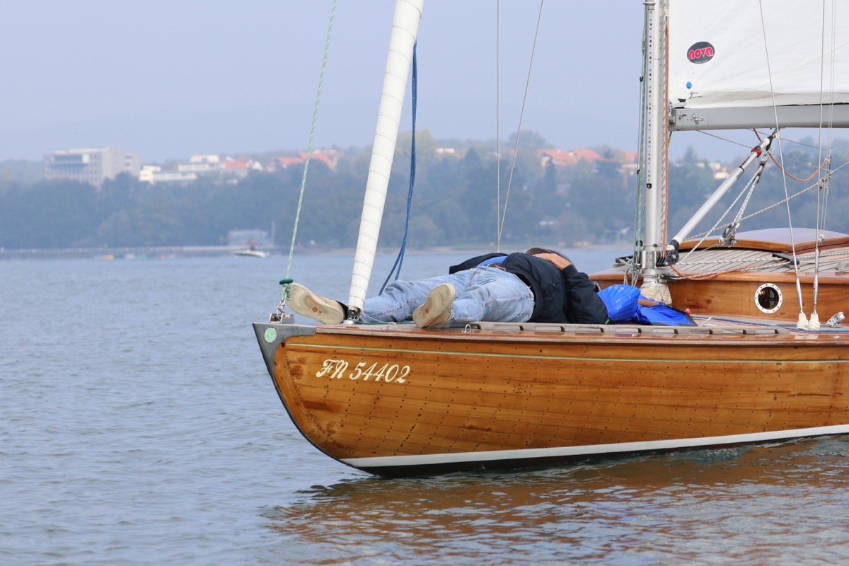 Am Samstag gab es um 10:00h eine kurze Steuermannsbesprechung und um 11:00h sollte es los gehen. Daraus wurde leider nichts. Wir sind zwar am Nachmittag ausgelaufen, aber es reichte noch nicht einmal für einen Startversuch. Der Wettfahrtleiter stresste unsere Nerven nicht - die Stimmung blieb trotz Flaute gut - und schickte uns unverrichteter Dinge wieder in den Hafen. Nur vereinzelte Thermik-Flecken auf dem See ließen einfach keine Wettfahrten zu.