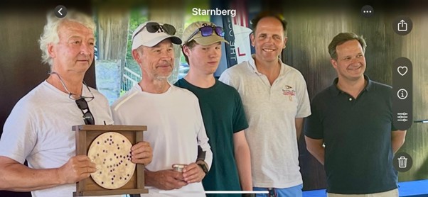 Nach den 4 Wettfahrten am Freitag gab es an der „Seeseitn“ im BYC Freibier. Im Anschluss auf der Clubterrasse einen Brotzeitteller mit Live Musik aus Österreich. Am Samstagabend gab es ein 5 Gänge Menü mit tollem Wein. Die Band von Charly Glas mit Sängerin hat uns super durch den Abend begleitet und es wurde auch fleißig getanzt. Somit hatten wir am Samstag nach einem Tag Club Sitzen und Baden doch noch Bewegung zumindest auf der Tanzfläche. Vielen herzlichen Dank an Cristian Dornier für den schönen Abend und Deine Unterstützung zu diesem Event. Am Sonntag hat unser Wettfahrtleiter Eberhard Fischer Brandies um 14.30 h zur Preisverteilung eingeladen.