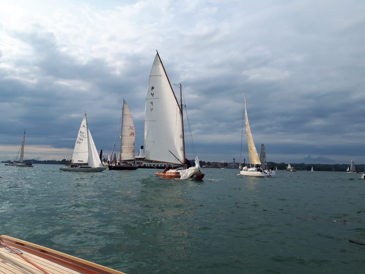 Irgendwie hatten die Herrschaften aus Konstanz ihren Turbo an Bord und auch eingeschaltet, weg waren sie. So weit weg, dass uns klar war, mit dem vorherrschenden Wind-Schlafmodus vor Langenargen ist an keine Aufholjagd zu denken. Wir konzentrierten uns daher fortan auf Ausweichmanöver zwischen Zweigen, Ästen und meterlangen Baumstämmen; die ans Ufer getriebenen Holzfelder, dort sicher geparkt, hatten sich wieder auf die Reise begeben und sich im See ausgebreitet. Wir bekamen keine richtige Fahrt mehr ins Boot, obwohl wir vollkonzentriert waren. Die Option, den nassen Spi nochmals zu ziehen, verfolgten wir nicht weiter, Geduld war also angesagt. Wir ließen auch das über uns ergehen, erstaunlicherweise waren wir nicht allzu übernächtigt, sodass wir die Ruhe genießen konnten.