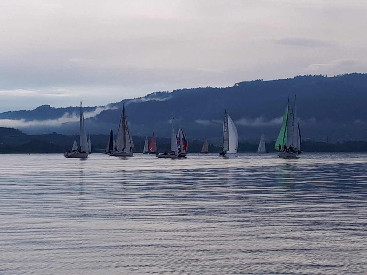 Passage gut gelungen, weiter ging´s mit guten 6 Knoten Fahrt, es wurde heller. So gegen 05.00 Uhr erkannten wir Friedrichshafen schemenhaft in der Ferne. Auch Gaudeamus war da, mit seinen unverkennbaren gelben Segeln, jedoch weiter unter Land, einigermaßen querab. Mithalten war angesagt, die Konkurrenz immer im Blick. Wir dachten, wir könnten noch was ausrichten, uns in einer einigermaßen akzeptablen Distanz halten - nix da.