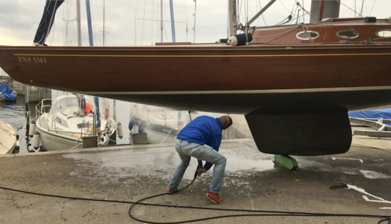 Ich hatte auch noch eine Baustelle offen. Bei unserem Ausflug zu den Regatten in Hard und Lindau hatten wir drei heftige Kollisionen unter Motor mit unbekannten Objekten, vermutlich schwerem Holz, welches, nicht sichtbar, unter der Wasseroberfläche trieb. Die Befürchtung war, dass dies Schaden am Kiel?, Schraube? oder Ruderblatt? verursacht hat. Wir haben die Romja kurz an den Kran gehängt. Zum Glück war nichts zu sehen. Die Reinigung der Außenhaut war dann nur noch ein erfreuliches Ereignis.